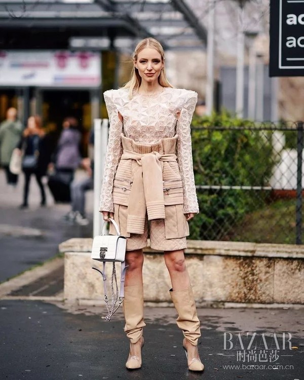 时装博主Iris Dijkers在前不久的巴黎时装周期间,就示范少女心十足的穿搭,白色阔筒靴中部的褶皱恰到好处,让整体造型看起来温柔俏皮。