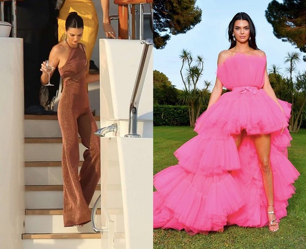 再看看前不久,Kendall在戛纳出席活动身穿梦幻礼服时的造型,同样的身材,在身穿连体裤时看起来却更显腿长。