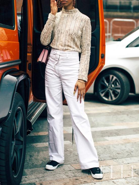 保持胯部宽松但又不要皱皱巴巴,这才是材质良好的白裤子该有的特点。