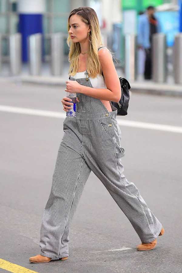 或是垂坠感十足的麻料背带裤搭配黑色抹胸短上衣,Gucci的皮毛拖鞋也是她来平衡造型的小心思,Margot Robbie真的是玩转材质表达的高手!