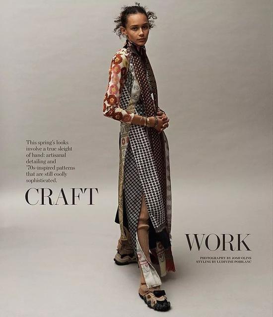花纹更有讲究,这种细一点的大花纹就很有宫廷感,加上一字肩上衣和不好好穿挂在两袖的风衣,都让造型自带摩登的复古情怀。