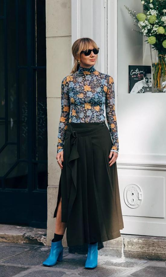 或是布满亮色大花朵的款式,下身换成长裙也没问题,蓝色踝靴是神来之笔,与衣服上的淡蓝色花相呼应,异常和谐。