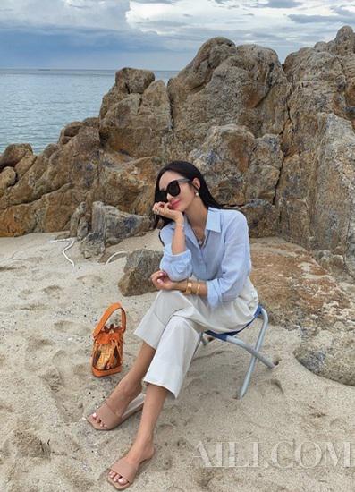 外出度假,穿腻了白色就可以选择一件轻薄质地的蓝衬衫兼顾防晒衫的功能性,搭配白色裤装,是清爽又简约的假日风格。