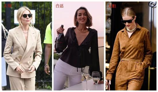 夏天经常穿大领口的衣服,尤其是有点宫廷风的衣服,单戴锁骨链比较秀气,戴大金链子则有一种“混搭”的现代感,对比一下,换个配饰,风格也差很远。