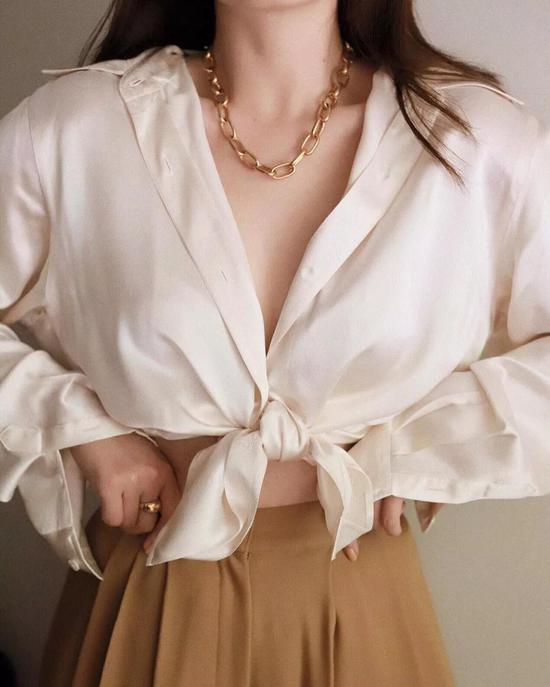 很多人觉得穿衬衫、西装很容易穿得严肃、职业感。一条大金链子就可以来救场了。有了它,很多基本款和偏职业的衣服,都能穿出酷酷的感觉。