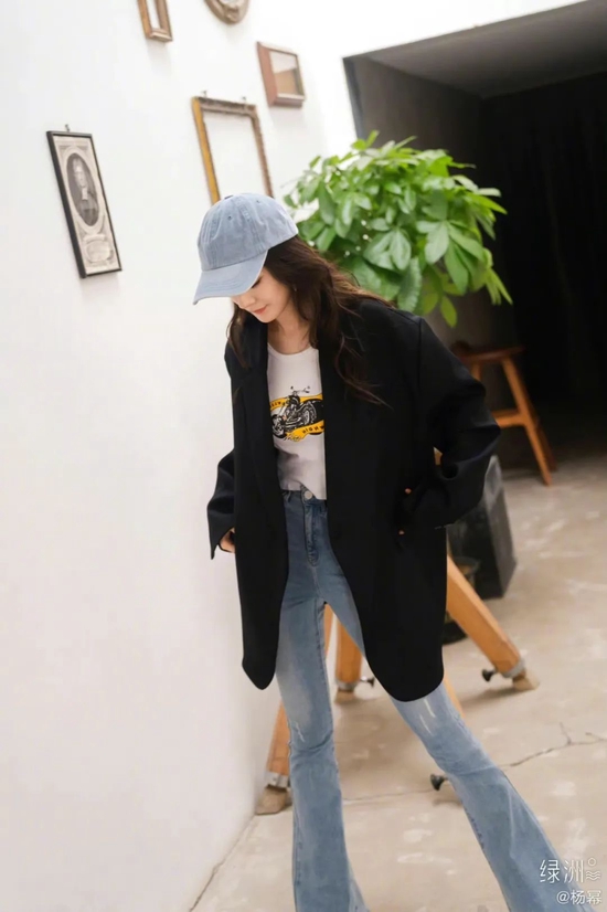 搭配喇叭牛仔裤则是另一种复古的感觉,加上棒球帽的加持,增加了美式的调性。这种短款上衣+高腰裤的搭配真的是显比例的“一把好手”。